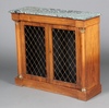 904 | A Regency inlaid brass chiffonier with green veined marble top, fitted adjustable shelves enclosed by grilled panelled doors 89cm h x 104cm w x 34cm d | 100-150 |