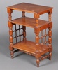 908 | An Art Nouveau oak Liberty style rectangular 3 tier what-not, the tiers supported by turned and block supports and with lattice work panels to the sides, raised on an H framed stretcher and bun feet 81cm h x 57cm w x 37cm d | 80-120 |