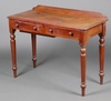 909 | A Victorian bleached mahogany dressing table with raised back, fitted 2 drawers and a crude secret drawer to the underside, raised on turned supports 78cm h x 104cm w x 46cm d | 60-80 |