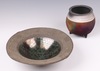 720 | John Wheeldon, (born 1950) a studio pottery textured stoneware purple bowl with lustre decoration to the centre 27cm diam. together with a cauldron shaped vase 14cm h (chip to rim) | 40-60 |