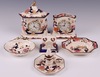 704 | A Masons blue Mandalay pattern arch shaped timepiece 13cm, 1 other timepiece, chamber stick and snuffer 13cm, scalloped dish 14cm, a shaped dish 17cm and a model of a house 9cm | 40-60 |