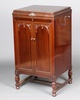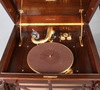 An HMV model 194 upright re-entrant tone chamber gramophone in mahogany cabinet, fitted a 5a soundbox, gilt "Selfridge, London" retailers mark to cabinet, gilt fixtures throughout (tonearm, platter, needle cups, speed adjuster, hinges). Complete with a box of additional items including numerous tins and boxes of needles, two boxed HMV Instantaneous Speed Testers, HMV wood and green velvet cleaner, An HMV No 5A Sound Box in original box, an Auto Record cleaner in original box, an HMV No 5A Fibre Needle Cutter in box with original Instructions and a Goldring "Juwel-Electro" soundbox. The mechanism is in "working" order. Please note: we do not guarantee speed, quality or longevity of playback. 113cm h x 63cm w x 56cm d