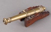 433 | H.M.S Royal George, a brass model table cannon raised on a stepped oak gun carriage (missing lower base/wheels). The 19cm cannon inscribed "Relic of the Royal George, Sunk 1782, Raised 1840". The Royal George sunk off Portsmouth in 1782 with the loss of 800 men, much of the later salvage and debris was turned into souvenirs. See lot 488 for another. | 150-200 |