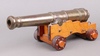 432 | H.M.S Royal George, a brass model table cannon raised on a stepped oak gun carriage (missing lower base/wheels). The 19cm cannon inscribed "Relic of the Royal George, Sunk 1782, Raised 1840". The Royal George sunk off Portsmouth in 1782 with the loss of 800 men, much of the later salvage and debris was turned into souvenirs. See lot 489 for another. | 150-180 |