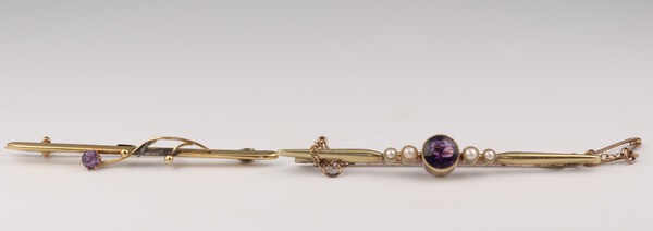 Lot 106 A gold marked 15ct bar brooch set amethyst and pearls 3.5g, together with a gold marked 9ct bar brooch set an amethyst with gilt metal pin 1.2g £80-100