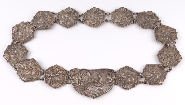 Lot 107 An Edwardian Art Nouveau silver belt, the buckle decorated reclining maidens, the links with embossed floral decoration, Birmingham 1903, marked W & H, the reverse marked Corkes Patent no.4956703, 178 grams gross £150-180