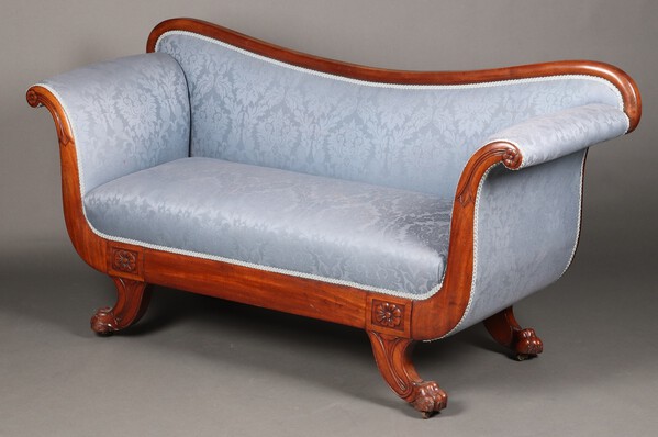 Lot 1078 A William IV mahogany show frame sofa upholstered in blue material, raised on paw supports 89cm h x 176cm w x 62cm d £100-200