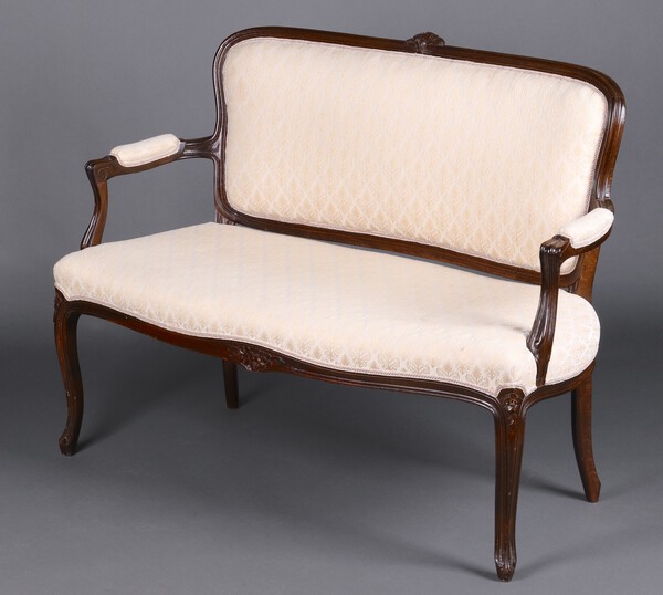 Lot 1083 An Edwardian style beech show frame settee upholstered in white and gilt fabric, raised on cabriole supports 93cm h x 121 cm w x 49cm d £50-75