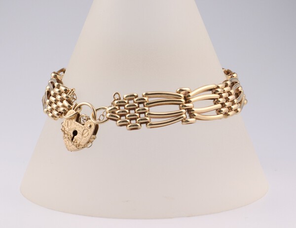 Lot 11 A 9ct yellow gold gate bracelet with a 9ct gold heart shaped padlock, 16cm, 16.8 grams £380-440