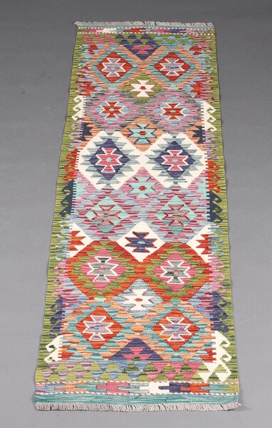 Lot 1108 A white, turquoise, green and purple ground Chobi Kilim runner with overall geometric designs 194cm x 63cm £50-75