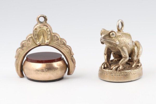 Lot 111 A 9ct gold hardstone set swivel pendant 2.8cm 4.9g, together with a yellow metal pendant in the form of a frog set a hardstone 2cm £100-150
