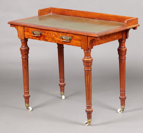 Lamb Manchester, a Victorian writing table with 3/4 gallery and green inset writing surface, fitted 1 long drawer marked Lam Manchester 3116, raised on turned and fluted supports with ceramic casters 75cm h x 90cm w x 50cm d