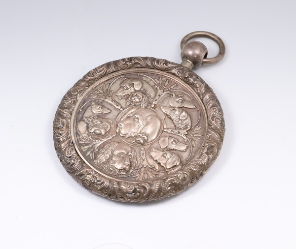 Lot 115 A Victorian silver plated circular fob, the obverse decorated reliefs of 7 dogs, the reverse a laurel wreath, the rim decorated foliage with fitted case (broken) £30-40