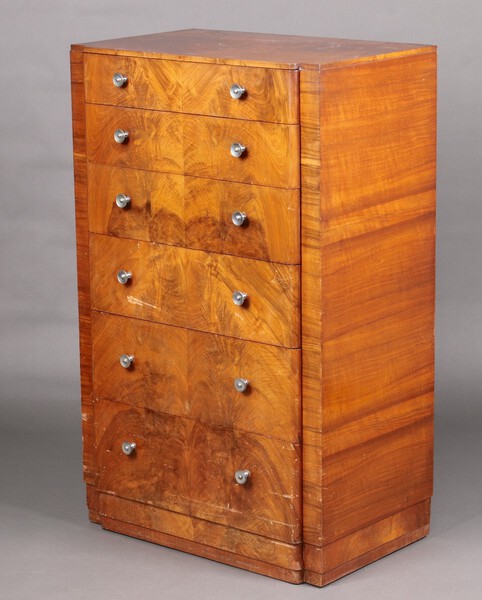 Lot 1156 A 1930's Art Deco figured walnut chest of 6 drawers, raised on a platform base 121cm high x 75cm w x 48cm d £90-120