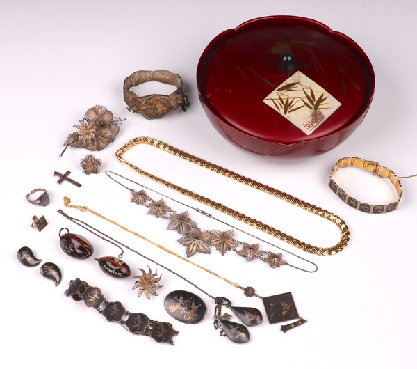 Lot 116 A Siamese Sterling silver brooch, ditto bracelet, pair of earrings, pair of ear clips and other costume jewellery, contained in a circular lacquered bowl and cover £40-60