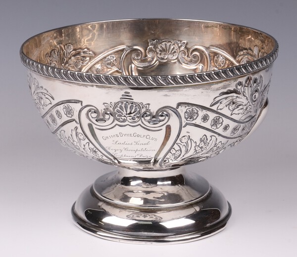 Lot 128 A circular embossed silver bowl raised on a plain spreading foot, with presentation inscription, Birmingham 1904 by Thomas Wooley, 398 grams £220-260