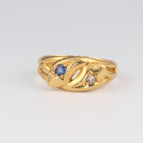 Lot 14 An 18ct yellow gold sapphire and diamond snake ring, the diamonds 0.03ct, the sapphire 0.05ct, size P, 3.8 grams SOLD £360