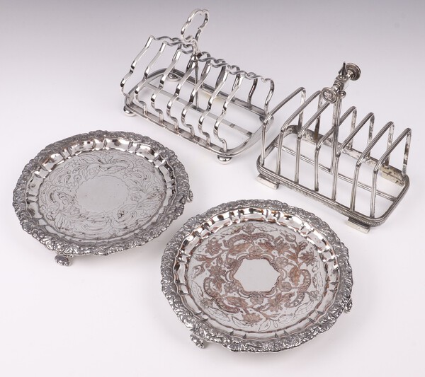 Lot 186 A 19th Century 7 bar silver plated toast rack (1 bar a/f), 1 other on bun feet (slightly misshapen) and a pair of 19th Century engraved silver plated salvers on panelled supports 18cm (plate worn in places) £40-50