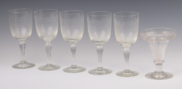 Lot 187 A 19th Century engraved wine glass with vinous decoration and tapered stem 13cm and 5 Edwardian engraved wine glasses with floral decoration