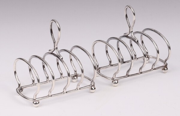 Lot 190 A pair of Victorian miniature silver 5 bar toast racks on bun feet, 7cm, London 1899, makers mark JHM, 77 grams SOLD £80