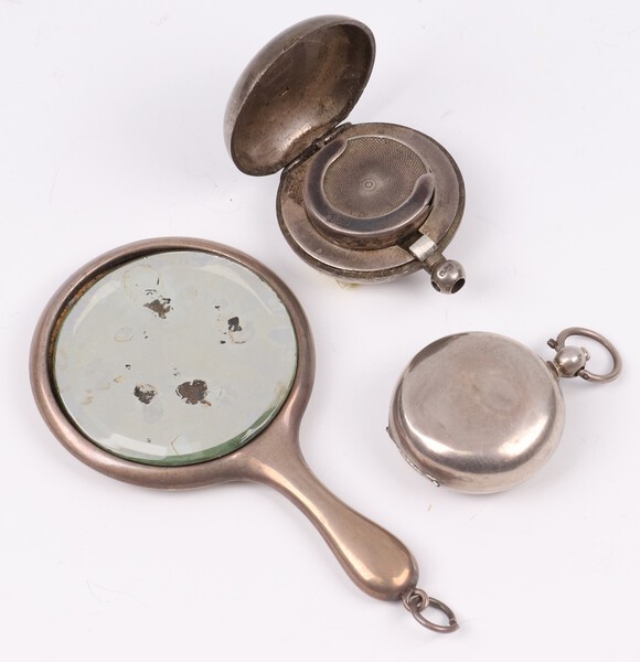 Lot 192 A Victorian silver sovereign case Chester 1897 (dents to lid), ditto London 1896 (f) and a miniature silver hand mirror Birmingham 1915 (mirror is loose to the mount) SOLD £40