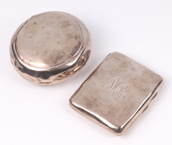 Lot 198 An Edwardian circular silver tobacco box, Birmingham 1906, together with a silver cigarette case Birmingham 1915, both monogrammed, 158 grams £80-120
