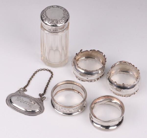 Lot 203 Four silver napkin rings (misshapen and dented) and a faceted glass pin jar with embossed silver lid, 9cm, together with a Sherry decanter label SOLD £40