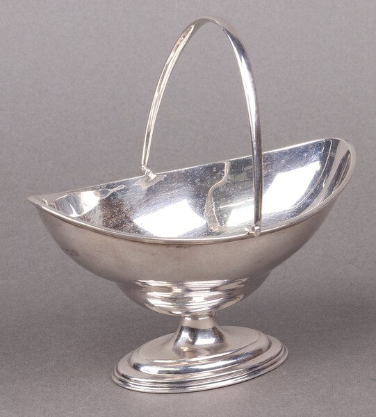 Lot 259 A Georgian style, silver boat shaped sugar bowl with swing handle, on a spreading foot, London 1924, 132g £70-90