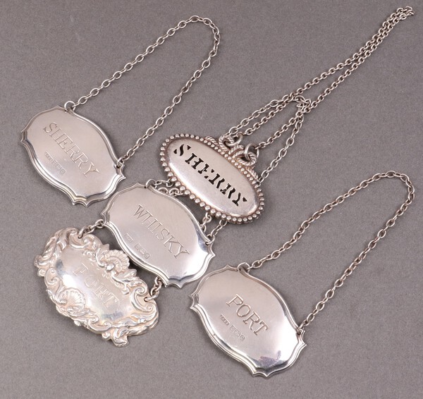 Lot 264 Two silver decanter labels - Port and Sherry, Birmingham 1990, 2 others Whisky and Port Birmingham 1992, 39g and a Sherry decanter label £40-60
