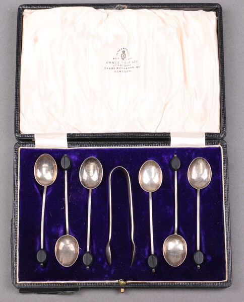 Lot 265 A cased set of 6 silver bean end coffee spoons Birmingham 1923, together with a pair of non matching sugar tongs Sheffield 1920, gross weight including beans 46g £40-60