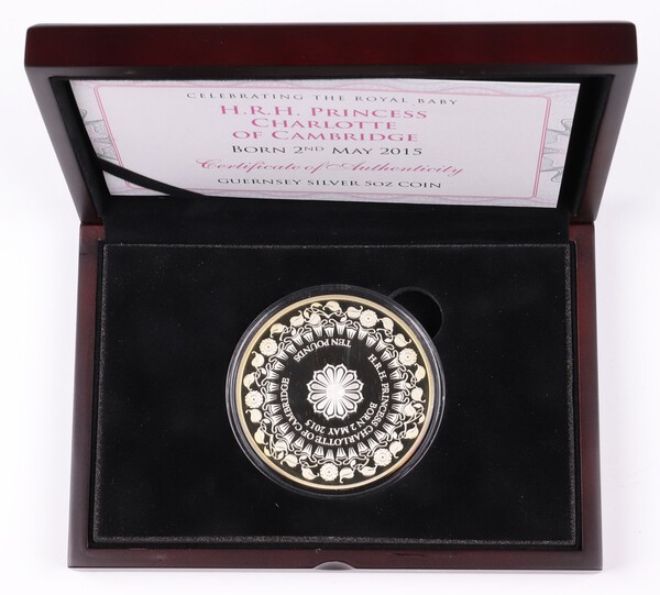 An Elizabeth II 925 Guernsey silver proof 10 pound coin 2015 celebrating the birth of Princess Charlotte, 5 oz, mint sealed, contained in fitted case with COA and card slip case. 13 of 250