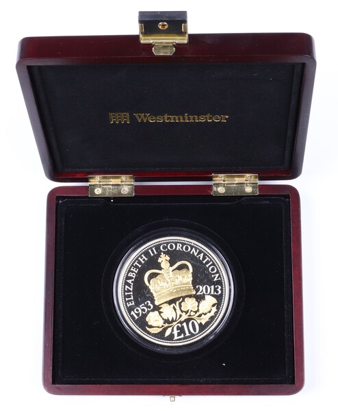 An Elizabeth II 925 Jersey silver proof and gold plated 10 pound coin 2013 celebrating the Coronation Jubilee, 5 oz and, mint sealed, contained in fitted case with COA. 403 of 450