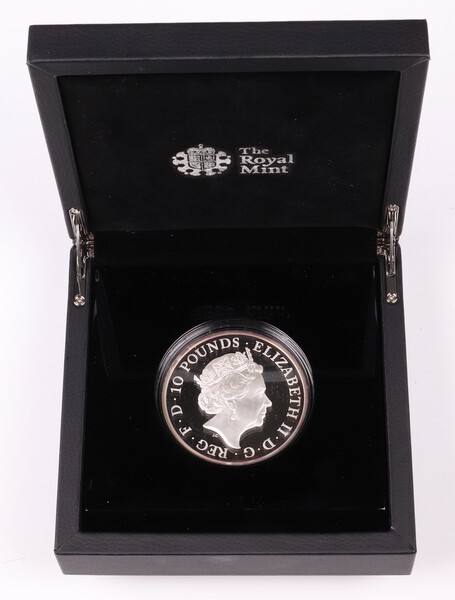 An Elizabeth II 999 silver proof 10 pound coin 2017 'The Queens Sapphire Jubilee', 5 oz , mint sealed, contained in fitted black presentation case with COA. 2 of 1500