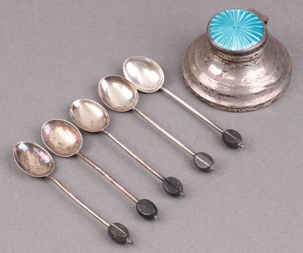 Lot 296 6 silver bean end coffee spoons Birmingham 1924, 35g gross, together with a silver capstan inkwell with enamelled lid Birmingham 1946 6cm (hinge damaged and dented throughout) £80-100