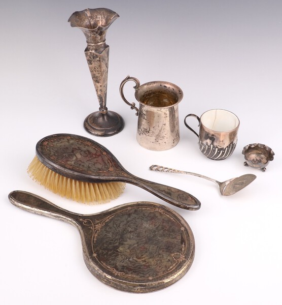 Lot 304 An Edwardian silver mug with S scroll handle, a spill vase, mounted cup, brush, mirror, jam spoon and salt, weighable silver 134 grams SOLD £140
