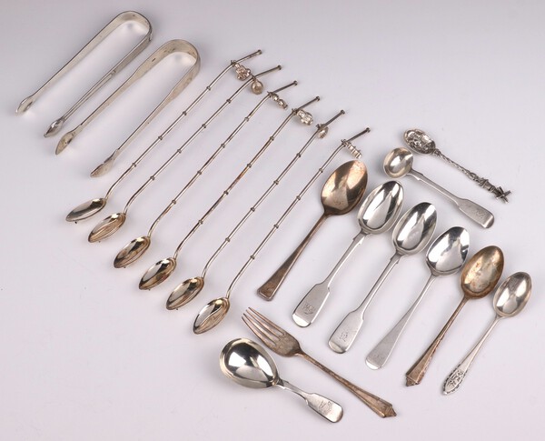 A pair of George III silver sugar nips and a collection of spoons, 320 grams