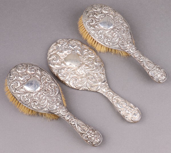 Lot 342 A 3 piece embossed silver backed dressing table set with hand mirror and pair of hair brushes, marked Frances, Chester 1900 £60-80
