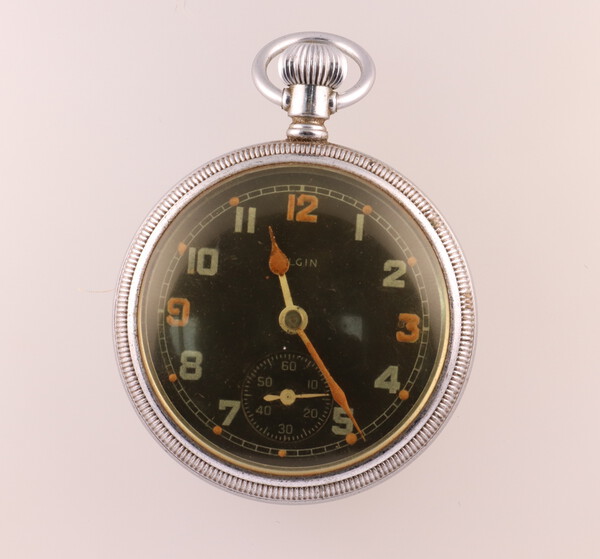 An Elgin Army Issue black dial mechanical movement pocket watch with coloured 12, 3 and 9, having a subsidiary seconds dial, the base stamped A108378 G.S.T.P in a 50mm case