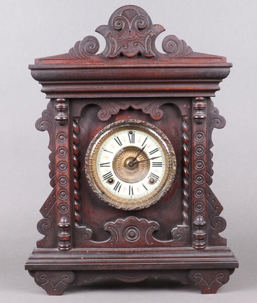 Ansonia, an American 8 day shelf clock with 12cm dial contained in a carved beech case, 17cm h x 35cm w x 12 cm d