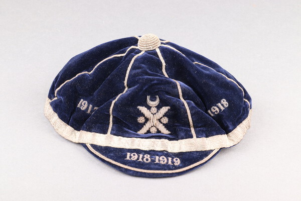 An early 20th Century Rugby / Football cap in blue cloth with gilt braiding. The crown with braided lettering "1918 1919" divided by a gilt logo of a Saltire beneath a Crescent, the brim lettered "1918-1918". Label to interior "Aitken and Niven, 40 Queensbury St, Edinburgh"