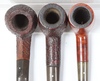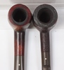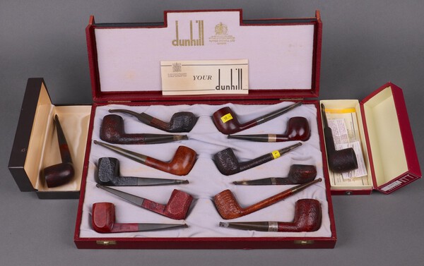 A red Dunhill shop presentation box containing 11 Dunhill pipes - Bruyere EK, Red Bark 41241, a Shell 41241, a 43038 Bruyere, Shell Briar, Shell 498, Shell 5/3 with silver band, 4101 with silver band, Shell Briar, LBS with silver band, 1 other Dunhill pipe and a Lacroix S.A pipe, a Dunhill 59 Black Briar pipe in associated box, a Dunhill R6 Shell Briar in associated box