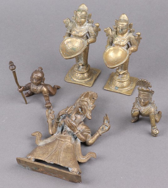 Lot 461 A 19th Century gilt bronze figure of a standing Gnash 16cm, pair of gilt bronze figures of temple attendants 13cm and 2 other bronze figures of kneeling attendants 8cm £50-75