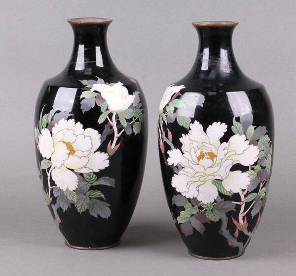A pair of black ground club shaped cloisonne vases with floral decoration 31cm