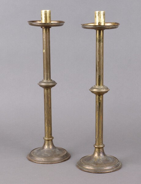 Lot 474 A pair of ecclesiastical brass candlesticks with drip trays, raised on circular bases 39cm x 11cm £40-60