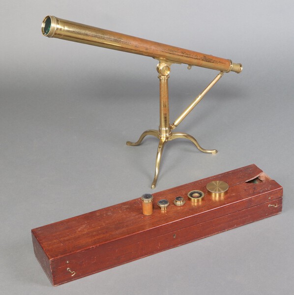 An early 19th Century brass refracting 2.5 inch table telescope, signed BATE LONDON to tube on raised folding tripod base with cabriole legs, rack and pinion adjustment tube with handled key, in fitted mahogany case containing three eyepieces and lens cover, 73cm l, extends to approx 114cm