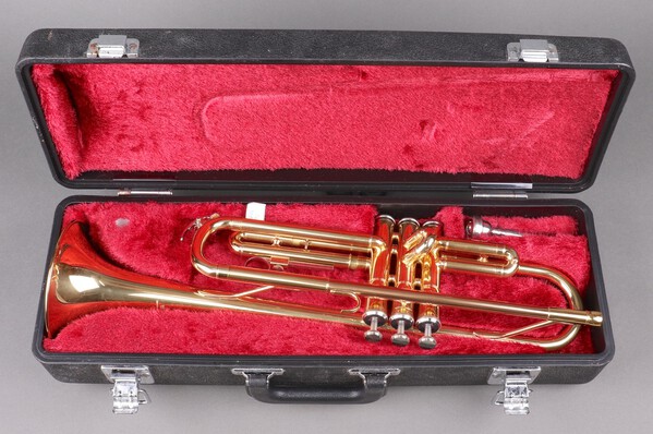 A Yamaha brass trumpet (1 valve jammed), complete with carrying case