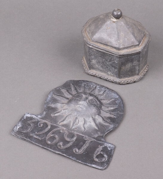 Lot 491 An 18th Century octagonal lead tobacco jar and cover 11cm x 12cm x 10cm and a cast lead insurance plaque marked 326916 17cm £40-60