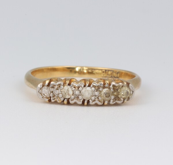 Lot 52 An 18ct gold and platinum illusion set 5 stone diamond dress ring, size I 1/2, 2.7 grams £120-150