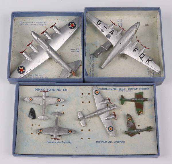 A Dinky No.62G model Boeing Flying Fortress boxed (damage to box), a Dinky 62W Imperial Airways Frobisher Class Airliner boxed (tail is broken and in 2, loss to paint fork), a Dinky Blenheim Bomber Hawker Hurricane (x2) and 2 Spitfires (a/f) boxed
