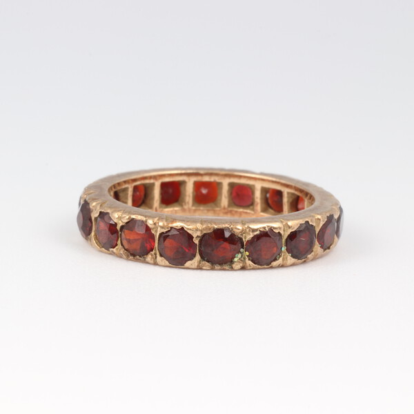 A 9ct yellow gold garnet set eternity ring, size H 1/2, 2.4 grams
